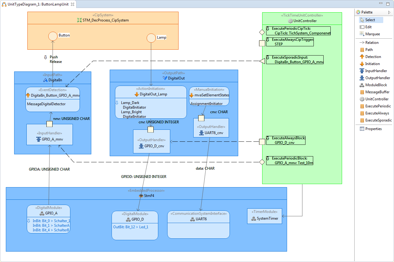 You model your state machines either using CIP or UML.StateMachine, and DEC Tool generates the necessary C or C++ Code to bind these state machines to the underlying hardware. You can change your hardware or state machine at any time, and DEC Tool will create the necessary bindings for you. The resulting code is independent of any operating system and allows you to access any hardware directly. DEC Tool handles all scheduling tasks for you also, i.e. reading inputs, writing outputs and triggering your state machines.